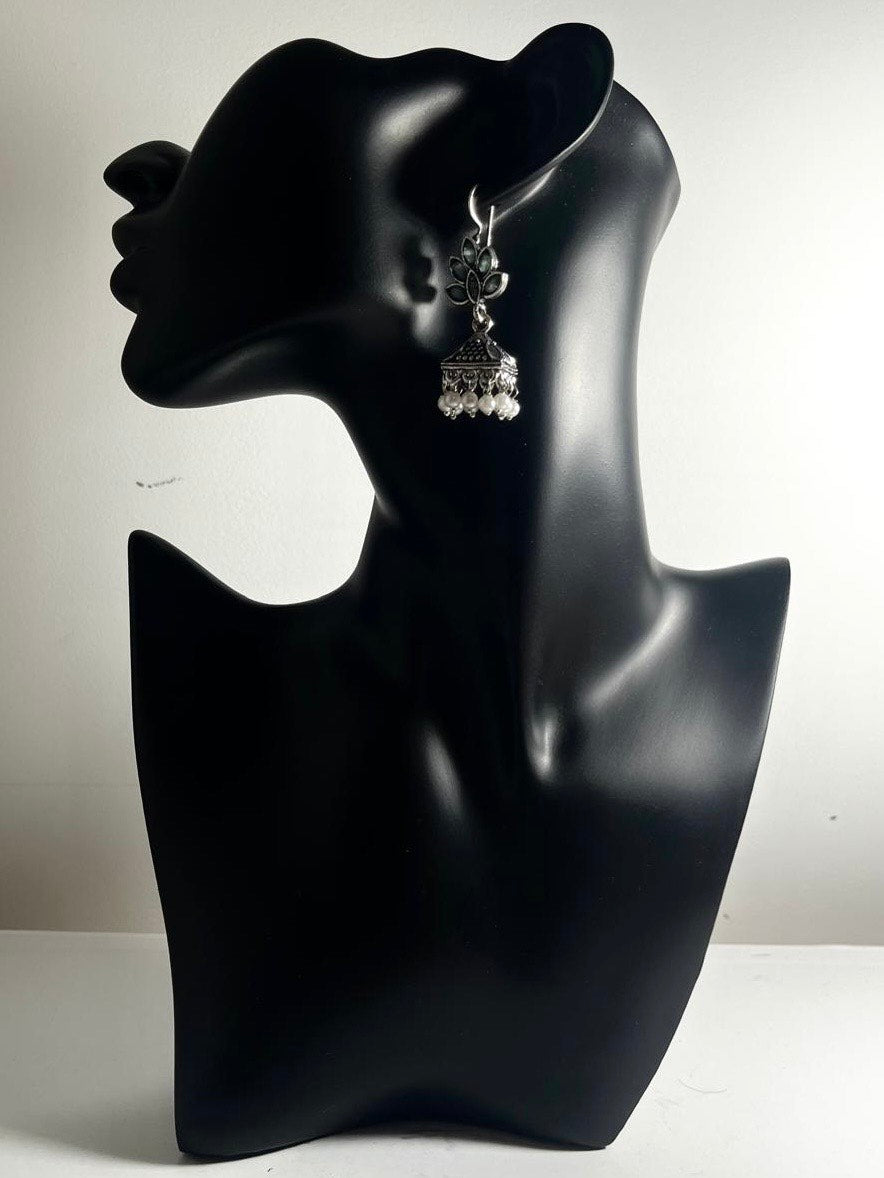 These Floral Jhumka Earrings feature a striking metallic finish and come in two contrasting shades of green and black. Designed for occasional wear, they blend traditional elegance with a contemporary touch, making them ideal for special events. The intricate floral design enhances their appeal, adding a refined charm to your look. Crafted to offer both style and durability, these earrings are a sophisticated choice for those seeking distinctive ethnic jewelry.